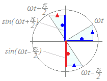 ○3 コンデンサCに流れる電流の位相は,その両端に加わる電圧の位相よりも進む.= sin(ωt−)になる (コンデンサは正弦波交流の位相を進める.)