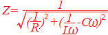もしも,可変抵抗Rも並列に接続されているのならば,右のインピーダンスの式は有限の値となり,電流は流れ,零となるようなことはありません.しかし,この問題ではL, Cだけが並列に接続されており,この部分についてはRの項がありません. (直列接続されているRは,並列接続の部分を求めてから,後で考えると分かりやすいでしょう.) L, Cの並列部分については, 「インピーダンスの分母が形式的に0 ⇒ インピーダンスが∞ ⇒ 電流が流れない」ということがあります. −Cω=0 のときに,これが起ります. このことは,並列回路において電流を表す式(Rの項がないとき)