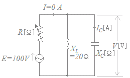 図のようなRLC交流回路がある。この回路に正弦波交流電圧E=100[V]を加えたとき,可変抵抗R[Ω]に流れる電流I[A]は零であった。また,可変抵抗R[Ω]の値を変えてもI[A]の値に変化はなかった。このとき,容量性リアクタンスXC[Ω]の端子電圧V[V]とこれに流れる電流IC[A]の値として,正しいものを組み合わせたのは次のうちどれか。 ただし,誘導性リアクタンスXL=20[Ω]とする。 ![]() 電圧V[V]電流IC[A]