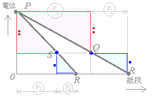 この図は横が抵抗R,縦が電位(電圧)Vになっており,傾きの大きさが電流Iを表す.PQ間とQR間に流れる電流が等しいので,図のPQRは直線になる.同様にしてPSRも直線