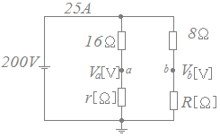 図の直流回路において,200[V]の直流電源から流れ出る電流が25[A]である。16[Ω]とr[Ω]の抵抗の接続点aの電位をVa[V],8[Ω]とR[Ω]の抵抗の接続点bの電位をVb[V]とする。Va=Vbとなるr[Ω]とR[Ω]の値の組合せとして,正しいものを次の(1)〜(5)のうちから一つ選べ。