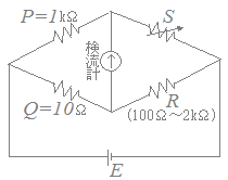 図のような,抵抗P=1[kΩ],抵抗Q=10[Ω]のホイートストンブリッジ回路がある。このブリッジ回路において,抵抗Rは100[Ω]〜2[kΩ]の範囲内にある。このRのすべての範囲でブリッジの平衡条件を満たす可変抵抗Sの値の範囲として,正しいのは次のうちどれか。
