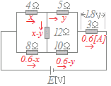 方程式として解くときでも,分かるものはなるべく数字にし,変数の数を減らす方が解きやすい.閉回路Aについて,々キルヒホフの第2法則を適用すると 4x+12(x−y)−8(0.6−x)=0…(1) 閉回路Bについて,キルヒホフの第2法則を適用すると 5y−10(0.6−y)−12(x−y)=0…(2) (1)→ 24x−12y=4.8 6x−3y=1.2…(3) (2)→ −12x+27y=6 −4x+9y=2…(4) (3)×3+(4) 14x=5.6 x=0.4 (3)に代入 −3y=−1.2 y=0.4 このとき E=4x+5y+1.8=1.6+2.0+1.8=5.4 |