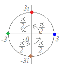 回転したものになる(赤丸:3i) さらに,iを掛けると,回転したものになる(緑丸:−3) さらに,iを掛けると,回転したものになる(茶丸:−3i) さらに,iを掛けると,回転したものになる(青丸:3)