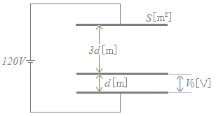 図のように,面積S[m2]の電極板からなる平行板コンデンサがある。この電極板と平行に同じ形の導体平板を図に示す間隔で入れ,このコンデンサの両端の電極に120[V]の直流電圧を加えて充電した。このとき,図中の電圧V0[V]の値として,正しいのは次のうちどれか。 ただし,電極板間の誘電体の誘電率は同一とし,充電前の電極及び導体平板の初期電荷は零とする。また,電極板及び導体平板の厚さ並びにこれらの端効果は,無視できるものとする。 ![]()