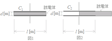 誘電体を挿入してから後では,厚さ[m]の空気,厚さ[m],比誘電率2の誘電体,厚さ[m]の空気からなるコンデンサが直列に接続されているのと同じことになる.