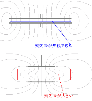 ※ コンデンサは別名キャパシタとも呼ばれる(英語圏).これに対応して,静電容量はキャパシタンスと呼ばれ,その単位がファラドという関係になる. 図1 ![]() ![]() 図3 ![]() ![]() ![]() ![]() ※試験問題などにおいては「コンデンサの端効果は無視できる」と書かれていることがある. 平行板コンデンサにおいては,図7のように電気力線が外側に膨らむ傾向があり,これを考慮すると静電容量の計算はとても複雑な式になる.しかし,極板の面積が極板間の間隔に比べて十分大きい場合には,極板間の電気力線は等間隔の平行線と見なすことができ,膨らみを考慮しなくてもよい.このような場合に「コンデンサの端効果は無視できる」という. コンデンサの端効果が無視できると書かれているときは,安心して C=ε の公式が使える. 図7 ![]() |