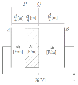 極板A-B間が誘電率ε0[F/m]の空気で見たされている平行平板コンデンサの空気ギャップ長をd[m],静電容量をC0[F]とし,極板間の直流電圧をV0[V]とする。極板と同じ形状と面積を持ち,厚さが[m],誘電率ε1[F/m]の固体誘電体(ε1>ε0)を図に示す位置P-Q間に極板と平行に挿入すると,コンデンサ内の電位分布は変化し,静電容量はC1[F]に変化した。このとき,誤っているものを次の(1)〜(5)のうちから一つ選べ。 ただし,空気の誘電率をε0,コンデンサの端効果は無視できるものとし,直流電圧V0[V]は一定とする。 ![]() (1)位置Pの電位は,固体誘電体を挿入する前の値よりも低下する。 (2)位置Qの電位は,固体誘電体を挿入する前の値よりも上昇する。 (3)静電容量C1[F]は,C0[F]よりも大きくなる。 (4)固体誘電体を導体に変えた場合,位置Pの電位は固体誘電体又は導体挿入する前よりも上昇する。 (5)固体誘電体を導体に変えた場合の静電容量C2[F]は,C0[F]よりも大きくなる。 HELP