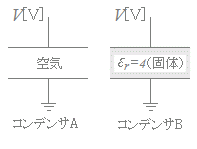 E= コンデンサAとBとは,電極板間の電位差V及び電極板間隔dが等しいから,電界の強さEも等しい. よって,内部電界は1倍 ○ 誘電率ε(比誘電率ε0εr)の誘電体で満たされた平行板コンデンサの静電容量は C=ε=ε0εr で求まり,電極板に蓄えられる電荷は Q=CV で求まるから, QA=ε0 V QB=ε0×4× V=4QA よって,電荷は4倍 →【答】(1)