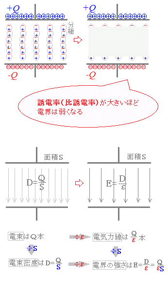 電束は理論上のものであるが,電荷に作用する力の元となる電気力線は誘電率の影響を受ける.右図11に示すように,誘電体の中では分極が起るので,誘電率ε(比誘電率εrで表せばε=ε0εr)が大きいほど電気力線の数が少なくなり電界は弱くなる.