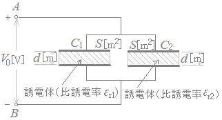 電極板面積と電極板間隔が共にS[m2]とd[m]で,一方は比誘電率がεr1の誘電体からなる平行平板コンデンサC1と,他方は比誘電率がεr2の誘電体からなる平行平板コンデンサC2がある。いま,これらを図のように並列に接続し,端子A, B間に直流電圧V0[V]を加えた。このとき,コンデンサC1の電極板間の電界の強さをE1[V/m],電束密度をD1[C/m2],また,コンデンサC2の電極板間の電界の強さをE2[V/m],電束密度をD2[C/m2]とする。両コンデンサの電界の強さE1[V/m]とE2[V/m]はそれぞれ(ア)であり,電束密度D1[C/m2]とD2[C/m2]はそれぞれ(イ)である。したがって,コンデンサC1に蓄えられる電荷をQ1[C],コンデンサC2に蓄えられる電荷をQ2[C]とすると,それらはそれぞれ(ウ)となる。