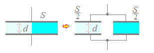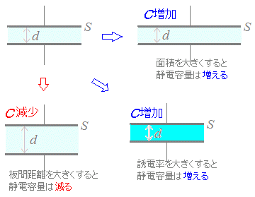 C=ε とすると,全体では面積が2倍になるから C’=ε =2Cと静電容量は2倍になる. このとき,もし電圧が変化していなければQ’=2CV=2Qとなり,蓄えられた電荷も2倍になる. ○図2左下のように,板間距離を大きくすると C=ε の分母dが大きくなるから,静電容量C[F]は小さくなる.