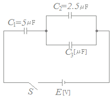 図のように,静電容量C1 , C2及びC3のコンデンサが接続されている回路がある。スイッチSが開いているとき,各コンデンサの電荷は,すべて零であった。スイッチSを閉じると,C1=5[μF]のコンデンサには3.5×10−4[C]の電荷が,C2=2.5[μF]のコンデンサには0.5×10−4[C]の電荷が充電された。静電容量C3の値として,正しいのは次のうちどれか。 ![]()