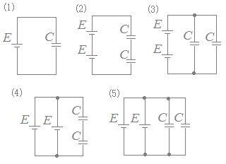 図に示す5種類の回路は,直流電圧E[V]の電源と静電容量C[F]のコンデンサの個数と組み合わせを異にしたものである。これらの回路のうちで,コンデンサに蓄えられる電界のエネルギーが最も小さい回路を示す図として,正しいのは次のうちどれか。