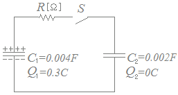 図の回路において,スイッチSが開いているとき,静電容量C1=0.004[F]のコンデンサには電荷Q1=0.3[C]が蓄積されており,静電容量C2=0.002[F]のコンデンサの電荷はQ2=0[C]である。この状態でスイッチSを閉じて,それから時間が十分に経過して過渡現象が終了した。この間に抵抗R[Ω]で消費された電気エネルギー[J]の値として,正しいのは次のうちどれか。 ![]() HELP