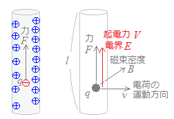 V=Bvlsinθ…(1’) 右図1の右側の図のように,電荷が磁界の中を運動すると,フレミング左手の法則により電荷は力を受ける.(実際には,電子の電荷は負なので逆向きになるが,これは後で向きを変えればよいとして,とりあえず大きさを求める.)