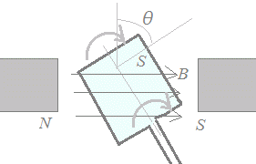 右図8のように一様な磁界の中でコイルを回転させるものとする.磁束密度をB[T],コイルの面積をS[m2],コイルの面が磁界に垂直な平面となす角をθ,コイルの回転の角速度をω[rad/s]とすると
