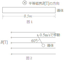 ○ 右図1のように,磁束密度B[T]の磁界の中で,長さl[m]の導線を磁束に垂直な方向に速度v[m/s]で動かしたとき,導線の両端に生じる起電力V[V]は