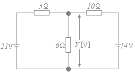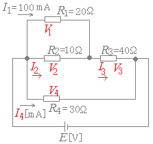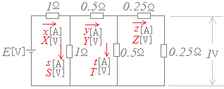 そこで,右側から順に電圧⇔電流を「将棋倒しのように」求めて行けます. 内容的には,x,y,z,s,t,Eの6個の未知数からなる6個の方程式の連立になりますが,これほど多いと混乱し易いので,「筋道を立てて算数的に」解く方が楽です. =4[A]
