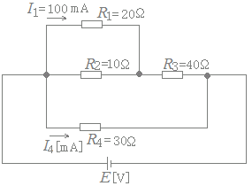 図のように,抵抗を直並列に接続した回路がある。この回路において,I1=100[mA]のとき,I4[mA]の値として,最も近いものを次の(1)〜(5)のうちから一つ選べ。 ![]()