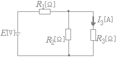 図のように,既知の電流電源E[V],未知の抵抗R1[Ω],既知の抵抗R2[Ω]及びR3[Ω]からなる回路がある。抵抗R3[Ω]に流れる電流がI3[A]であるとき,抵抗R1[Ω]を求める式として,正しのは次のうちどれか。 ![]() HELP