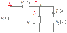 未知数を分かりやすくするために,左下図で示したように電流をx, y,抵抗R1をzで表す.