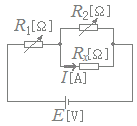 図のように,可変抵抗R1[Ω],R2[Ω],抵抗Rx[Ω],電源E[V]からなる直流回路がある。次に示す条件1のときのRx[Ω]に流れる電流I[A]の値と条件2のときの電流I[A]の値は等しくなった。このとき,Rx[Ω]の値として,正しいものを次の(1)〜(5)のうちから一つ選べ。 条件1:R1=90[Ω],R2=6[Ω]