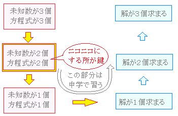 1→2→3と登るイメージ ![]() ※とにかく「2個2個」の連立方程式にするところが重要です.(そこら先は中学で習っているのでたぶん解けます.) よくある失敗は「一度に1個にしようとして間違ってしまう」「方程式の個数と未知数の項数が合わなくなってしまう」というような場合です.