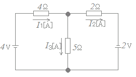 ○ 電流I1,I2,I3の向きを右図1のように想定しましたが,実際に図ってみると例えば2[Ω]の抵抗に加わる電圧は上側よりも下側の方が高いかもしれません.すなわちI2は逆向きかもしれません.しかし,このような場合にはI2は計算結果として負の値になるようになっています.つまり,電流の向きは,初めの想定と同じ向きならば正の値,逆向きならば負の値になりますので,どちら向きに想定しても構いません.