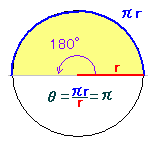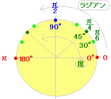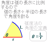 しかし,円周の長さ,円の面積など長さや面積を角度で表わすためには, θ=(弧の長さ)÷(半径の長さ) で定義される弧度法(単位はラジアン)の方が有利で,特に微分積分では角度の単位としては弧度法を使います。