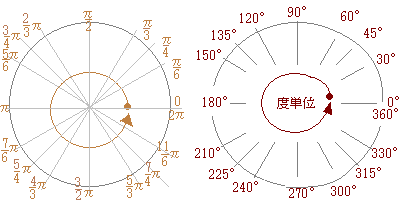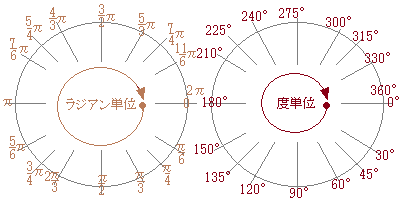 よく使う角度について,ラジアンと度は次の図のように対応している.