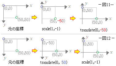 注意(2)コンテキスト.scale(1, -1);によって,y座標の符号を逆にすると,次の図11,図12の元の座標のように画面上のy座標がすべて負になり,使いにくくなります.そこで,コンテキスト.translate(a, b);によって,原点を(a, b)に平行移動する変換を併用するとよい.