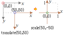 数学の教科書に出てくる,図13のような座標系にするには,コンテキスト.translate(50, 50);の後にコンテキスト.scale(50, -50);とすればよい.