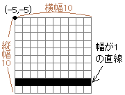 このstroke-widthに指定する直線の幅は,cm,pxなどいろいろな単位を付けることもできますが,単位を付けると描画領域とviewBoxの拡大(縮小)比の影響を受けます.むしろ,単位を付けずに,viewBoxのスケールの大きさで測ったものとすると簡単です.例えば,viewBox="-5 -5 10 10"の場合,左上端の座標を(−5, −5)とする横幅10,縦幅10の範囲が描かれるので,stroke-width="1"とすると,右図のような太い棒になります. stroke-widthを省略すると,stroke-width="1"になります. 通常の太さの直線にするには,stroke-widthに小数を使って,stroke-width="0.1"などとすればよいでしょう. |