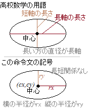 <ellipse cx=".." cy=".." rx=".." ry=".." stroke="color1" stroke-width=".." fill="color2" /> (B) 中心の座標(cx, cy),横半径rx,縦半径ryの他はstyle属性として書き並べる方法 <ellipse cx=".." cy=".." rx=".." ry=".." style="stroke:color1; stroke-width:..; fill:color2;" />