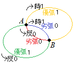 劣弧(0)は赤と青,そのうち反時計回り(0)は赤の弧 <path d="M 3,5 A 3,2 0 1 0 6,7" style="stroke:green;stroke-width:0.2;fill:none;" /> 優弧(1)は緑とオレンジ,そのうち反時計回り(0)は緑の弧 <path d="M 3,5 A 3,2 0 0 1 6,7" style="stroke:blue;stroke-width:0.2;fill:none;" /> 劣弧(0)は赤と青,そのうち時計回り(1)は青の弧 <path d="M 3,5 A 3,2 0 1 1 6,7" style="stroke:orange;stroke-width:0.2;fill:none;" /> 優弧(1)は緑とオレンジ,そのうち時計回り(1)はオレンジの弧