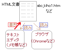 1) 自分のパソコンの中(または指定されたサーバ内の特定のフォルダ)に名前を付けて保存したHTML文書を,Chromeなどのブラウザから読んで,しっかりできているかどうか確かめます.2) このとき,右のイメージ図のように,HTML文書に書き込めるのは,テキストエディタだけです.読む方は,テキストディタとブラウザの両方から読んでいます. 以後は,「テキストエディタで少し手直しをして」「ブラウザで確認する」という作業を繰り返すことになります. 3) テキストエディタでHTML文書が書き換えられても,ブラウザの方はリロード(再読み込み,更新 4) たとえば自分の作品を先生が学校のWebページにアップしたとき,メモ帳などのテキストエディタにそのHTMLファイルのURLでファイル名を指定して読み出しても,読み出すことはできますが,今度は書き込むことはできません.(権限がないからです) このようにして,「書き換え作業は自分のパソコンや指定されたフォルダで行う」「サーバに転送する権限のある人に転送してもらったら,サーバ上のHTMlファイルに対してはブラウザで読むだけ」になります.&hellp;通常の場合,サーバ上のファイルをテキストエディタで直接書き換えることはできません. |