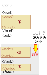 (7) 前方参照は禁止 ブラウザはHTML文書の先頭から順に読み込んで行って,内容を解析して処理していきます.だから,ある時点では左図のように,読み込みが完了した部分と,まだ読み込んでいない部分に分かれます. プログラミングの分野で,まだ登場していない定義を先に使ってしまうミスを「前方参照」ということがあります.その事情は,ブラウザが読み込みながら処理していく過程でも同様で「前方参照は禁止」です…undefinedのエラーになります. たとえば,Aのボディにおいて,<img src="abc.png" name="image1">と定義されている画像を@の段階で書き換えたり,動かしたりしようとすると,まだ定義されていない画像を処理することはできないという意味でエラーになります.しかし,HTML文書が全部読み込まれてから,その操作を行うことは問題なくできます. 同様にして,Bに定義されている変数や関数を@やAで使おうとするときにも同様の問題が起こります.