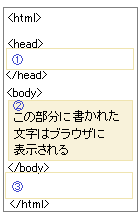 の3つの部分から成り立っています.A<body>と</body>に囲まれたボディ部分(これが本文), B</body>から</html>までの部分(あまり利用されない.ヘッダに対してフッタと言えそうだが,はっきりそのように書かれた記事は見かけない) HTML文書はWebページとも呼ばれますが,Aのボディ部分にメモ帳などのテキストエディタで書き込まれた文字は,ブラウザから読むことができます. |