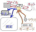 • 入力と出力…あなたがパソコンを操作しているとき,キーボードやマウスを通じてパソコンに情報を送り,パソコンが処理した結果が画面に表示される.この場合において,あなたとパソコンとでは,主体と客体が逆になるが「コンピュータ関連の用語としては,パソコン(CPU)を主体として,パソコン(CPU)から見た立場で,用語の使い方が決められる」.すなわち,パソコンのシステムに情報が入ることを「入力」,パソコンから情報が出ることを「出力」と呼ぶ.