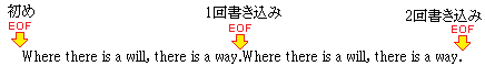 open()関数を使ってwモードでファイルを開いたとき,ファイルは0バイトになって,先頭位置にEOFがあります.そこで,文字列を1回書き込むと,文字列の最後の位置にEOFが来ます.だから,オブジェクト名.write(文字列)を2回行った場合,上書きされるのでなく,同じ文字列が2回書き込まれます.