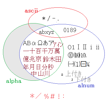 • alphaに入るものは,必ずalnumに入るので,alphaであってかつalnumでないもの(図の灰色の部分)はない.