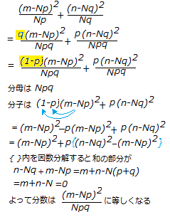 の正規分布で近似され,![]() ここで,事象Aが起こる観測度数がmとなるときのχ2を求めると ・・・(1) ・・・(2)![]()